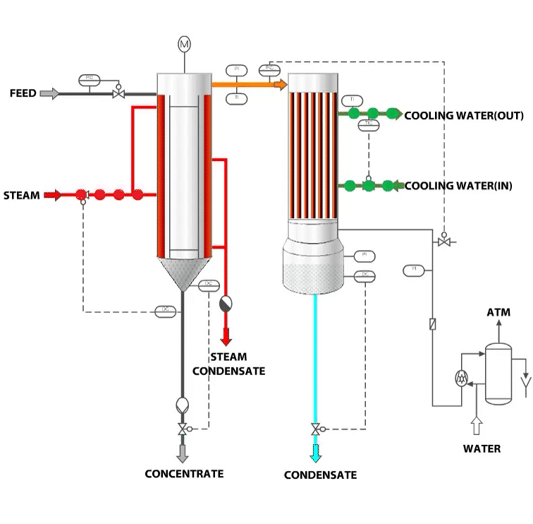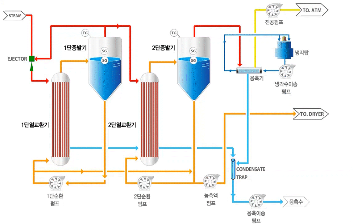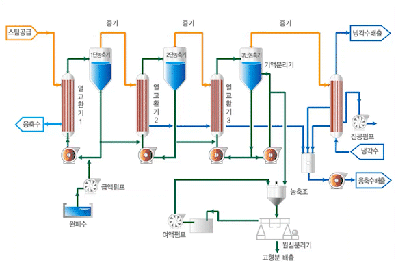º» ½Ã½ºÅÛÀº EVAPORATOR °¡ ´ÙÁßÈ¿¿ë°üÀ¸·Î¼ Æó¼ö¸¦ ±Þ¾×ÆßÇÁ·Î EVAPORATOR ÀåÄ¡¿¡ ³ÖÀº ÈÄ 1´Ü¿¡¼ Áõ¹ß ³óÃàÇÑ ´ÙÀ½ Áõ¹ßµÈ VAPOR¸¦ ÀÌ¿ë, ÈÄ´ÜÀÇ EVAPORATORÀÇ ¿¿øÀ¸·Î ÀÌ¿ëÇÏ´Â ½Ã½ºÅÛÀ¸·Î ¿¡³ÊÁö Àý¾àÇü Áõ¹ß ³óÃà ½Ã½ºÅÛÀÌ´Ù. ±¸Á¶ ¹× ÀÛµ¿Àº ¿ø¾×À» ÆßÇÁ·Î EVAPORATOR ÀåÄ¡¿¡ °ø±ÞÇÑ ´ÙÀ½ SEPARATOR ¿¡ ÀÏÁ¤ ¼öÀ§°¡ µÉ ¶§, ¼øÈ¯ÆßÇÁ ±âµ¿ ¹× ½ºÆÀÀ» °ø±ÞÇÑ´Ù. ÀÌÈÄ ¿Âµµ°¡ »ó½ÂÇϸé SEPARATOR ¿¡¼´Â ±â¡¤¾×ÀÌ ºÐ¸®µÇ°í VAPOR ´Â ¼øÂ÷ÀûÀ¸·Î ´ÙÀ½ ´Ü°èÀÇ ¿±³È¯±â¿¡ °ø±Þ, ¼øÈ¯µÇ´Â ³óÃà¾×À» Áõ¹ß½ÃŰ´Â ¿¿øÀ¸·Î ÀÌ¿ëµÇ¸ç ÃÖÁ¾ ´Ü°è¿¡¼ ¹ß»ýµÈ VAPOR ´Â Äܵ§¼¿¡ ÀÀÃàµÇ°í Äܵ§¼¿¡ ¿¬°áµÈ Áø°øÆßÇÁ´Â EVAPORATOR ÀåÄ¡¸¦ Áø°ø»óÅ·ΠÀ¯Áö½ÃŰ¸é¼ ÃÖÁ¾ÀûÀ¸·Î ¾òÀ¸·Á°í ÇÏ´Â ³óÃà¾×À» ¹èÃâÇϰí, ³óÃà¾×Àº Å»¼ö ¶Ç´Â °ÇÁ¶ÇÏ¿© ó¸®ÇÑ´Ù.
