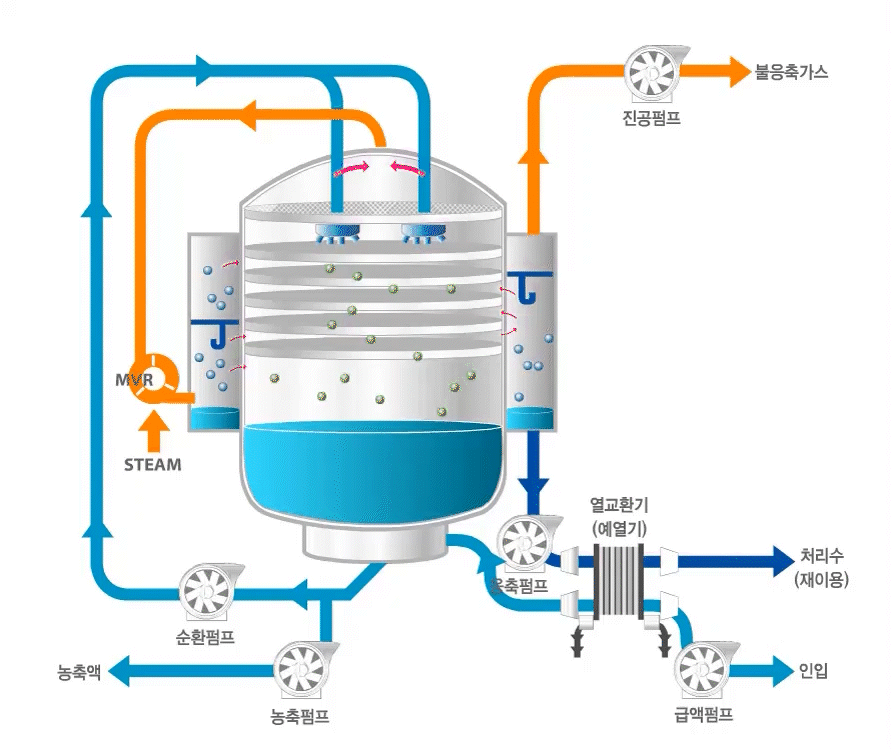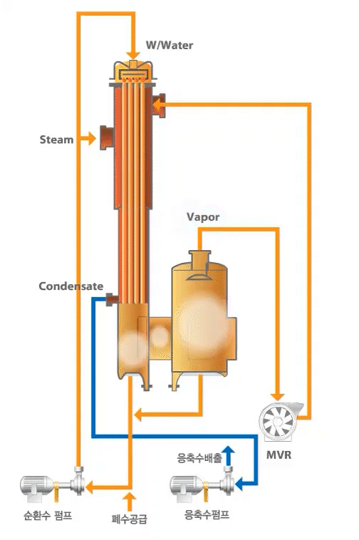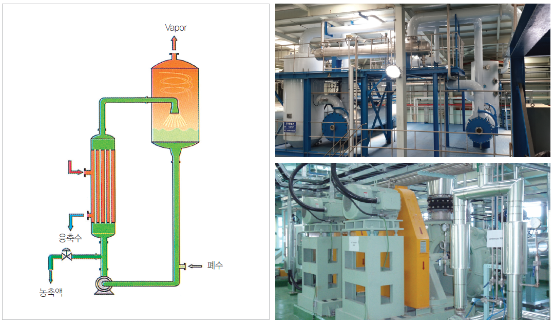 V-MEC(Áø°øÁõ¹ß³óÃà)½Ã½ºÅÛÀº ¹°ÀÇ ºñµîºÐ¸®¸¦ ÀÌ¿ëÇÑ Áõ¹ß±â¸¦ Áø°ø»óÅ·ΠÀ¯ÁöÇÏ¿© ¾×ü¸¦ Àú¿Â¿¡¼ Áõ¹ß½ÃŰ´Â ÀåÄ¡ÀÌ´Ù. ÀÌ ÀåÄ¡´Â µ¿ÀÏ°è ³»¿¡¼ ¾×ü¸¦ Áõ¹ß, ³óÃà, ÀÀÃàÀÌ µ¿½Ã¿¡ ÀÌ·ç¾îÁö´Â ÄÞÆÑÆ®ÇÑ °ÍÀÌ Å« Ư¡À̸ç Áõ¹ß½Ã Áõ±âÀÇ Àá¿ ¹× Çö¿±îÁöµµ Àü·® ȸ¼öÇÏ¿© Áõ¹ß¿¿øÀ¸·Î ÀçÀÌ¿ëÇÏ´Â ½Ã½ºÅÛÀ¸·Î ¿¡³ÊÁö¸¦ ȹ±âÀûÀ¸·Î Àý°¨ÇÒ ¼ö ÀÖÀ¸¸ç, »ý»êµÈ ÀÀÃà¼ö´Â °ø¾÷¿ë¼ö·Î ÀçȰ¿ëÇÒ ¼ö ÀÖ´Â ÀåÁ¡ÀÌ ÀÖ´Ù. ƯÈ÷ V-MEC ½Ã½ºÅÛÀº ¼øÈ¯µÇ´Â Æó¼ö°¡ Àü¿Æ©ºê Ç¥¸éÀ» ¼¼Ã´ÇÏ´Â ºÐ»çÀ¯ÇÏ ÇüÅÂÀÇ ¼öÆò°üÇü Æ©ºê±¸Á¶·Î µÇ¾î ÀÖ¾î ½ºÄÉÀÏ(Scale) ºÎÂø·üÀÌ ÀûÀ¸¸ç Áø°ø»óÅÂÀÇ Àú¿Â¿¡¼ Áõ¹ßµÈ Áõ±â¸¦ ºê·Î¿ö(Blower)·Î ÈíÀÔÇÏ¿© ¾ÐÃà ½Â¿Â ÈÄ Áõ¹ß±â Æ©ºê¿¡ °í¼ÓÀ¸·Î À¯ÀÔÇÏ¿© ºÐ»êµÇ´Â Æó¼ö¸¦ Áõ¹ß½ÃŰ´Â ¿¡³ÊÁö·Î ÀÌ¿ëµÇ¹Ç·Î ¹æ¿µÇ´Â ¿¡³ÊÁö¸¸ °ø±ÞµÇ¹Ç·Î ¿¡³ÊÁö Àý¾àÈ¿°ú°¡ ¶Ù¾î³ª´Ù. ¶ÇÇÑ ³ºÐÇØ¼º COD Á߱ݼÓÀ» ¿Ïº®ÇÏ°Ô Ã³¸®ÇÏ´Â ÃÖ÷´Ü ³óÃ༳ºñÀÌ´Ù.
