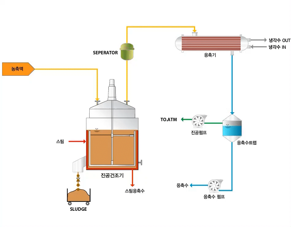 °ÇÁ¶±â º»Ã¼¿¡ ÀÏÁ¤·®ÀÇ Æó¾×À» ÅõÀÔ(ȸºÐ½Ä)ÇÏ°í º»Ã¼ ¿ÜºÎ ½ºÆÀ ÀÚÄÏ¿¡ Áõ¹ß¿¡³ÊÁöÀÎ ½ºÆÀÀ» °ø±Þ, °£Á¢¿À» ÀÌ¿ëÇÏ¿© ¼öºÐÀ» Áõ¹ß½ÃŰ´Â ½Ã½ºÅÛÀε¥ ¿îÀüÁ¶°ÇÀº Áõ¹ß¿Âµµ 65-75¡ÆC, Áø°øµµ -500~630 mmHgÀ̸ç, À̶§ Áõ¹ßµÈ Áõ±â´Â ±â¾×ºÐ¸®±â¿¡ À¯ÀԵǾî 1Â÷ ºñ¸»µ¿¹Ý¹°ÁúÀÌ Á¦°ÅµÇ°í ¼ø¼öÇÑ VAPOR ¸¸ ÀÀÃà±â¿¡¼ ¿ ±³È¯µÇ¾î ÀÀÃà¼ö·Î ¹èÃâµÇ°í, ÃÖÁ¾ ³²Àº ¾×ÀÌ °ÇÁ¶¹°ÀÌ´Ù.